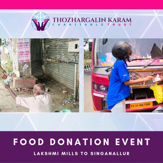 தோழ-க அறக்கட்டளை உணவு வழங்கும் நிகழ்வு 27th March 2022 / மார்ச் 27, 2022 Thozhargalin Karam Charitable Trust have planned to distribute food for the homeless and the underprivileged people who lives at the road sides. Hence, the team have organized four tracks as follows, Gandhipuram - VOC Track Lakshmi Mills - Singanallur Track Railway station - GH Track Townhall - Ukkadam Track Our TKCT volunteers owned each tracks and provided food to the Street stayers over the track. Nearly 170 food packets along with water bottles, had been provided to them. The TKCT team wholeheartedly thanks the volunteers who have taken part in the event and the Trustees, members & supporters who contributed their support. "We dont need deep pockets to help the poor and the hungry, but we need to have a heart to do so" - Kevin Dcruz ~•~•~•~•~•~•~•~•~•~•~•~•~•~•~•~•~•~•~• கோவையின் சாலையோர பகுதிகளில் தங்கியிருக்கும் ஆதரவற்ற மக்களுக்கு தோழர்களின் கரம் அறக்கட்டளை உணவு வழங்கி உதவ எண்ணியது. அதை முன்னிட்டு, கோவை மாநகரில் நான்கு முக்கிய பகுதிகளை பின்வருமாறு வழித்தடங்களாகப் பகுத்தது. காந்திபுரம் - வ. உ. சி வழித்தடம் ரயில் நிலையம் - அரசு மருத்துவமனை வழித்தடம் லட்சுமி ஆலை - சிங்காநல்லூர் வழித்தடம் நகர் மண்டபம் - உக்கடம் வழித்தடம் தோழ-க அறக்கட்டளையின் நான்கு குழுக்கள் ஒவ்வொரு வழித்தடத்தை தமக்கு உரித்தாக்கி, அவ்வழிகளில் சாலையோரம் தங்கியிருக்கும் மக்களுக்கு உணவுத் தொகுப்பு மற்றும் தண்ணீர் உள்ளிட்டவை வழங்கினர். இந்நிகழ்வு நிகழக் காரணமான, நிகழ்வில் கலந்து கொண்டு பணியாற்றிய தோழ-க அறக்கட்டளையின் தன்னார்வலர்கள், தக்க ஆதரவு அளித்த உறுப்பினர்கள் மற்றும் அறங்காவலர்களுக்கும், அறக்கட்டளை நன்றிகளை தெரிவித்துக் கொள்கிறது. "வறியார்க்கொன்று ஈவதே ஈகைமற் றெல்லாம் குறியெதிர்ப்பை நீர துடைத்து" - குறள் 221